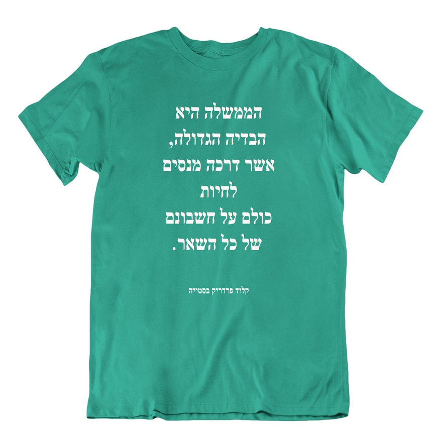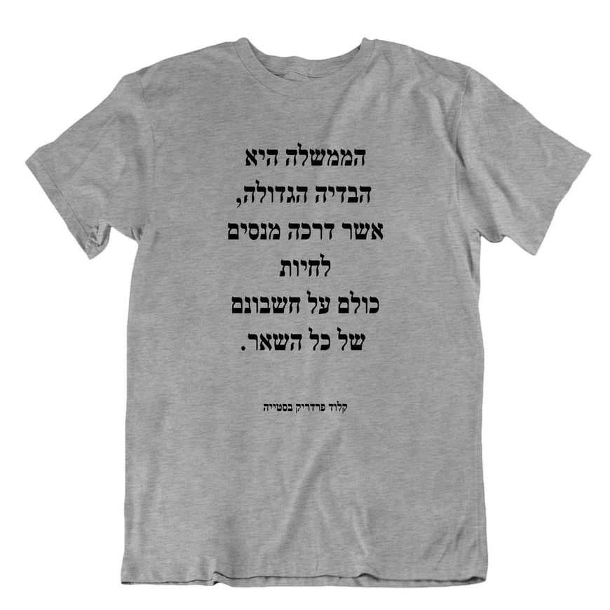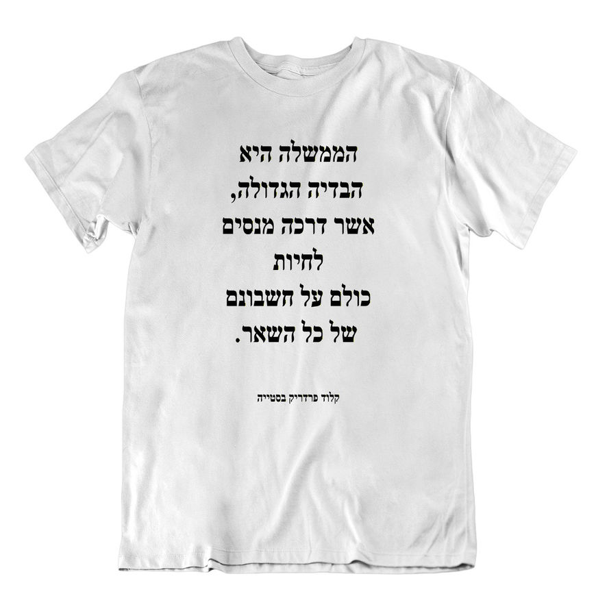חולצה עם אמירה נחרצת הממשלה היא הבדיה הגדולה, אשר דרכה מנסים לחיות כולם על חשבונם של כל השאר. "קלוד פרדריק בסטייה"